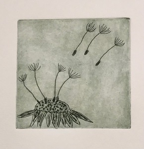 2020Er is een nieuw uitheems plantje ontdekt: Omdat we in een onzekere corona-tijd leven heb ik deze ets gemaakt! Ingelijst en met passepartout