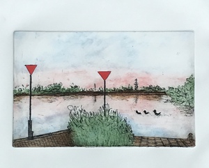 2018De overstroomde uiterwaarden zijn iedere keer weer indrukwekkend. Daarom heb ik deze ets gemaakt. Met passepartout en lijst